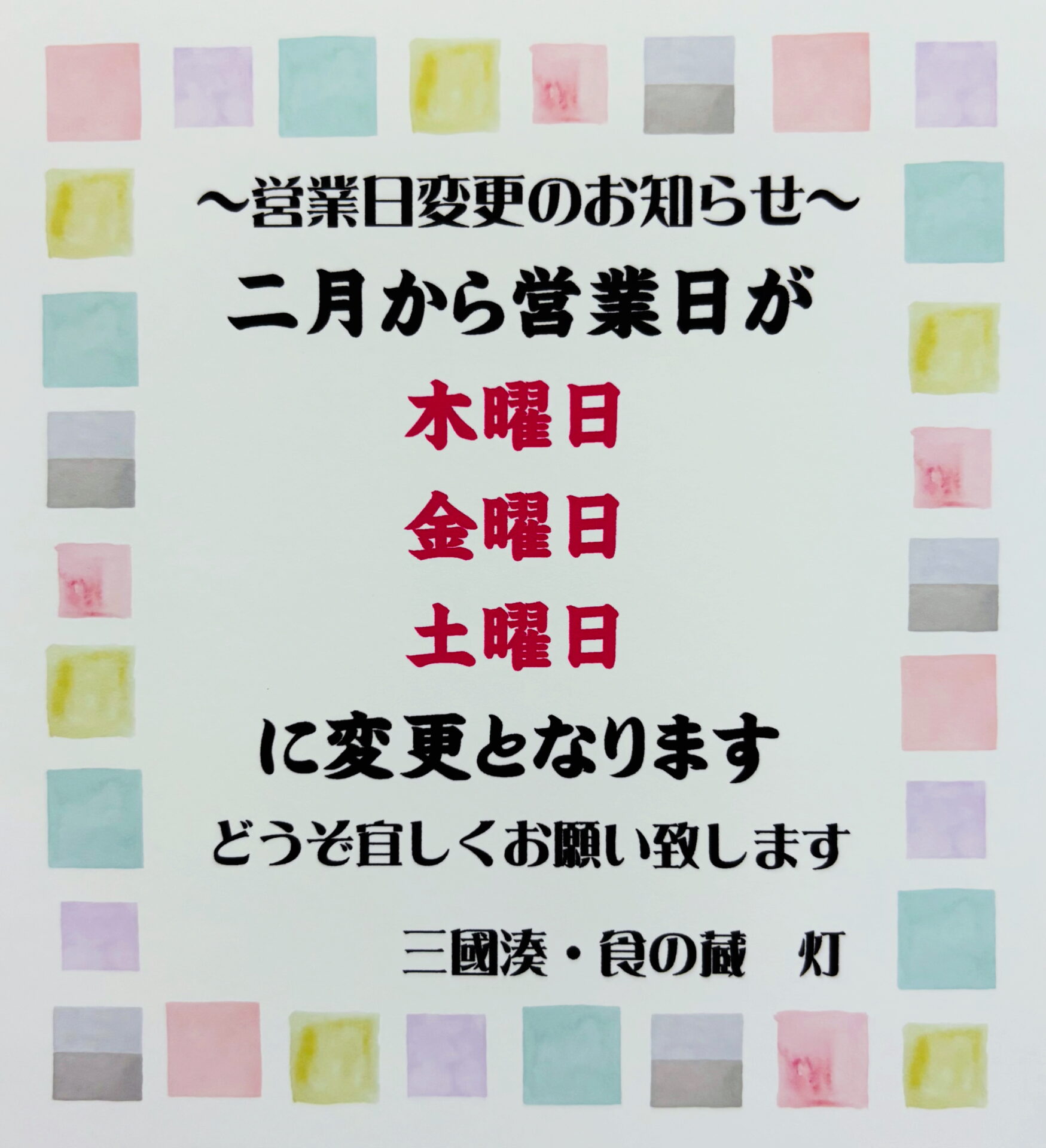 R8年2月から営業日が変更となっております。ご不便をお掛けしますがどうぞ宜しくお願い致します。